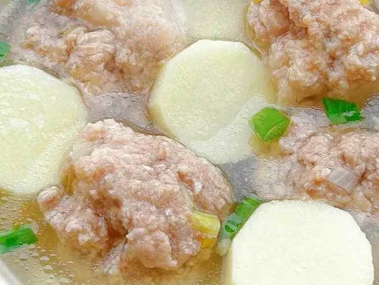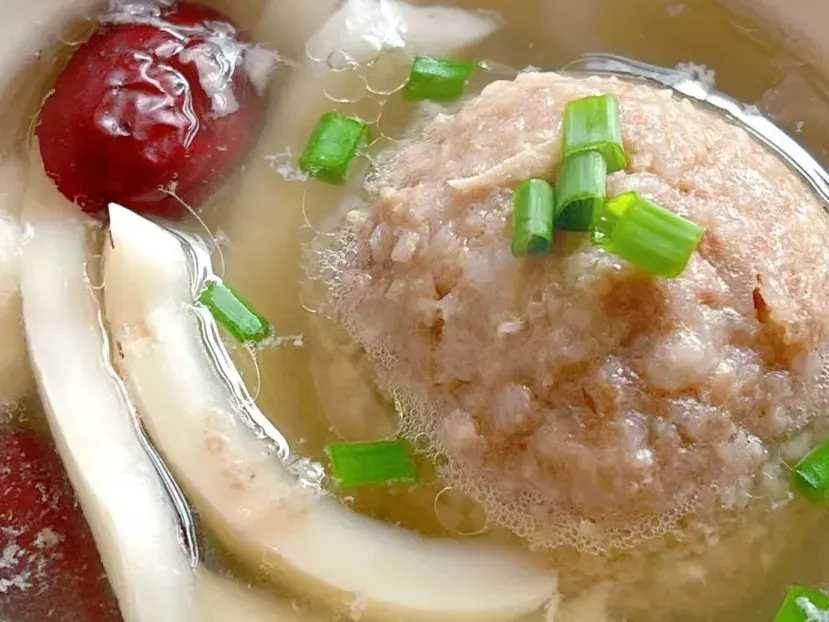 3、山藥煮熟后,加入肉末丸子,煮三分鐘煮熟后,加入少許食鹽調味,撒上蔥花攪拌均勻即可出鍋開吃。