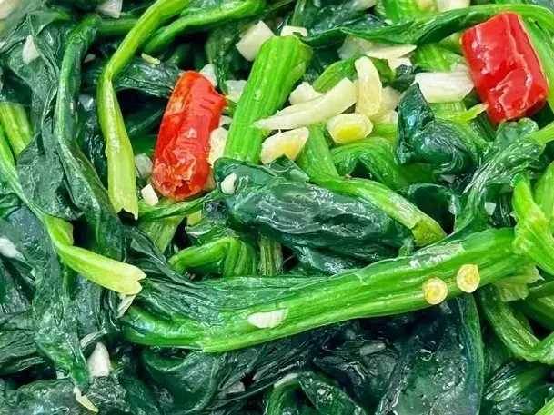 3、起鍋燒油,油熱后放入蒜末和小米辣炒出香味,再放入菠菜翻炒均勻,加入適量食鹽和雞精調味,翻炒均勻入味即可出鍋裝盤開吃。