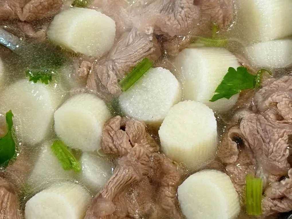 3、山藥煮八分鐘煮熟,再放入牛肉煮三分鐘煮熟。最后加入食鹽和胡椒粉調味,攪拌均勻煮至入味即可出鍋裝盤開吃。