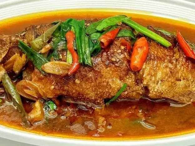 4、接著放入鱸魚,蓋上蓋子煮十五分鐘,中途要翻面。煮至入味后,大火收汁,放入蔥段和青線椒,煮熟即可出鍋裝盤開吃。