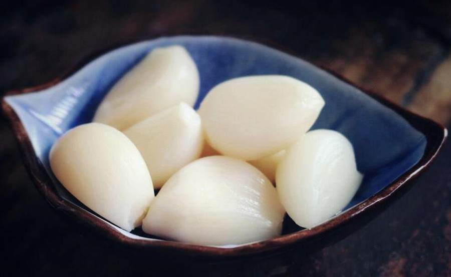 2、提前準備一盆鹽水,把剝好皮的大蒜倒在鹽水中浸泡著,泡上12個小時,時間要長點,不然不好腌透。為啥要用鹽水泡一下呢,這樣可以去除大蒜中的辛辣味,吃起來就沒有辣胃的感覺了。