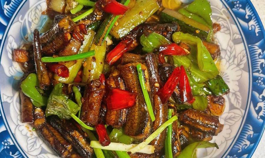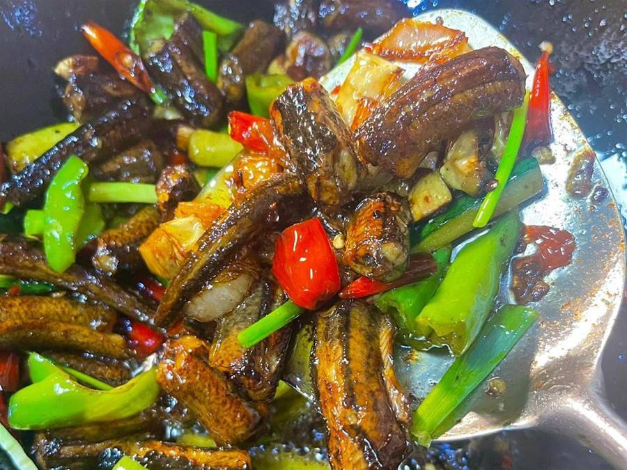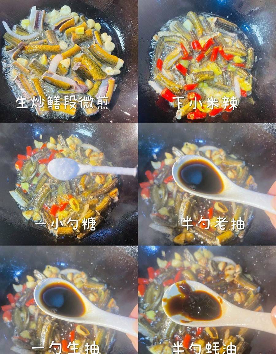 3、爆炒鱔段:熱鍋燒油,先爆香生姜、大蒜和洋蔥,再下入鱔段進行高溫爆炒。