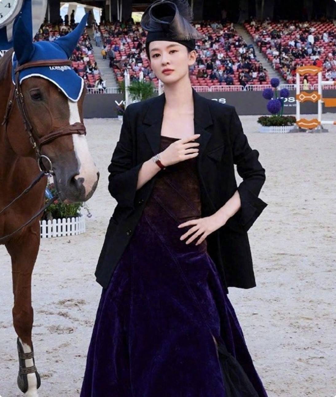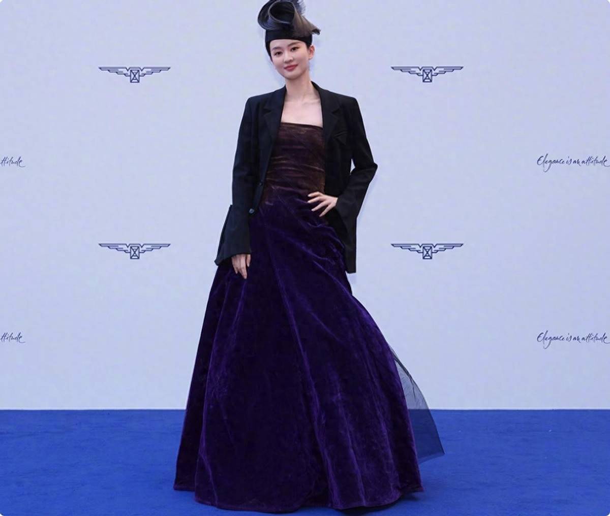 紅毯上,她穿著一身紫色禮裙,還搭著黑色的西裝外套,本來走的是紫色妖姬的路線,結果光線太差,一出場就是一坨黑乎乎的造型。