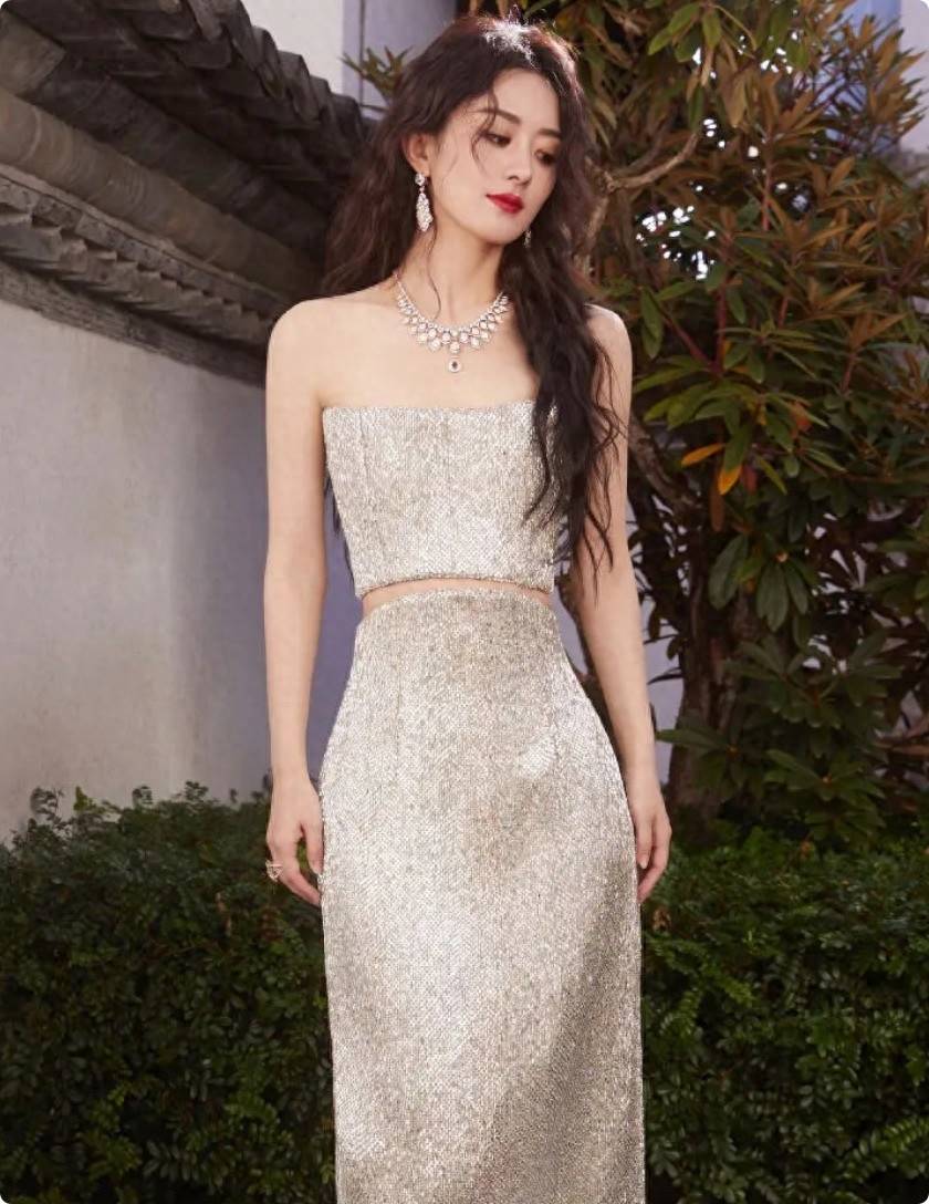 這一套造型,趙麗穎走的是優雅公主的路線,但是緊接著的這套銀色禮裙,就是妥妥的御姐女神。