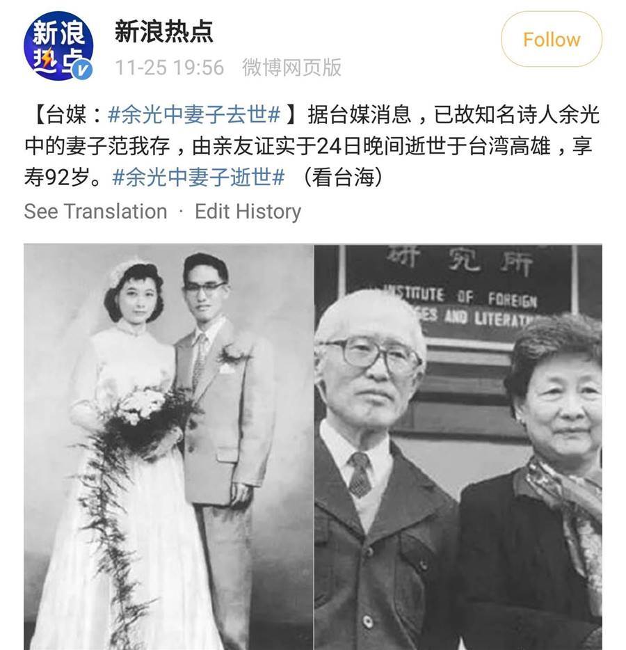 據微博熱搜得知,余光中妻子于24日晚間逝世于台灣高雄,享壽92歲。小V選了幾段余老最經典的名句翻譯成英文,送余光中妻子一程,以此緬懷余老及其妻子。