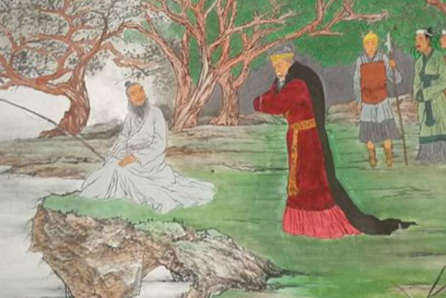 周文王第二天就帶著隨從來到了武吉所說的河邊,此時一個胡子白花花的老頭子,拿著一個沒有魚鉤和魚餌的魚竿在那里釣魚,看樣子老頭子就是武吉所講的那位「智者」了。