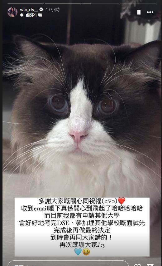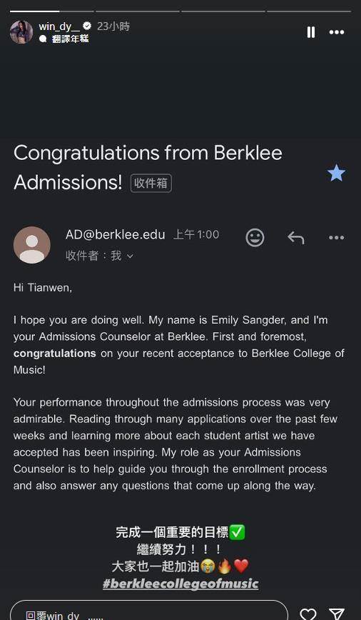 正在備戰DSE的詹天文分享收到學校取錄通知的電郵,興奮說:「完成一個重要的目標,繼續努力!!!大家也一起加油!」伯克利是世界著名音樂府,不少粉絲、網友都留言為