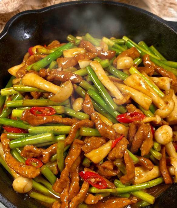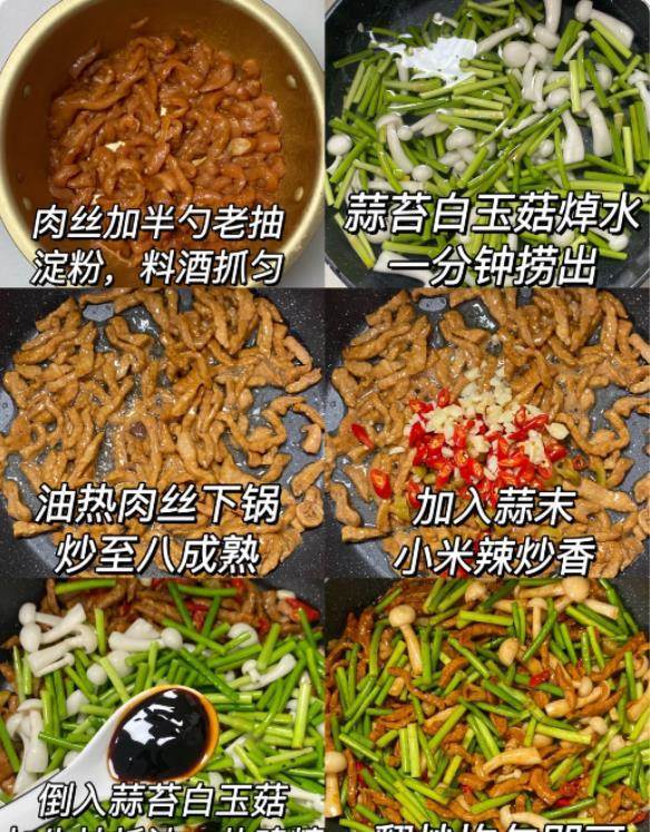 材料:蒜薹,瘦肉,白玉菇,大蒜末,小米辣。