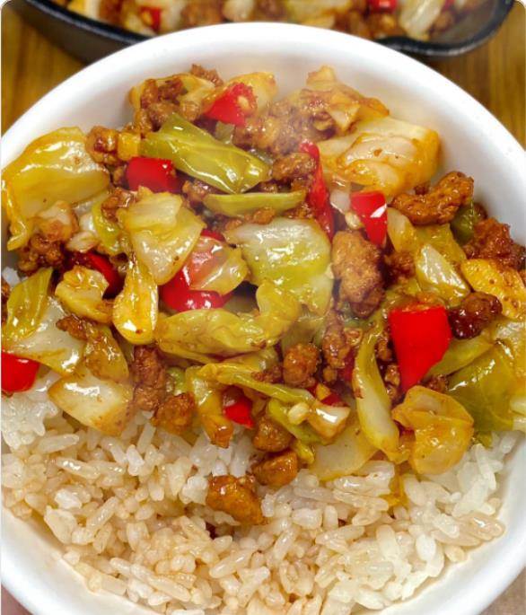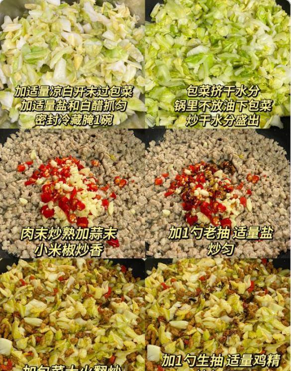 材料:包菜,肉末,小米辣,大蒜,鹽,雞精,老抽。