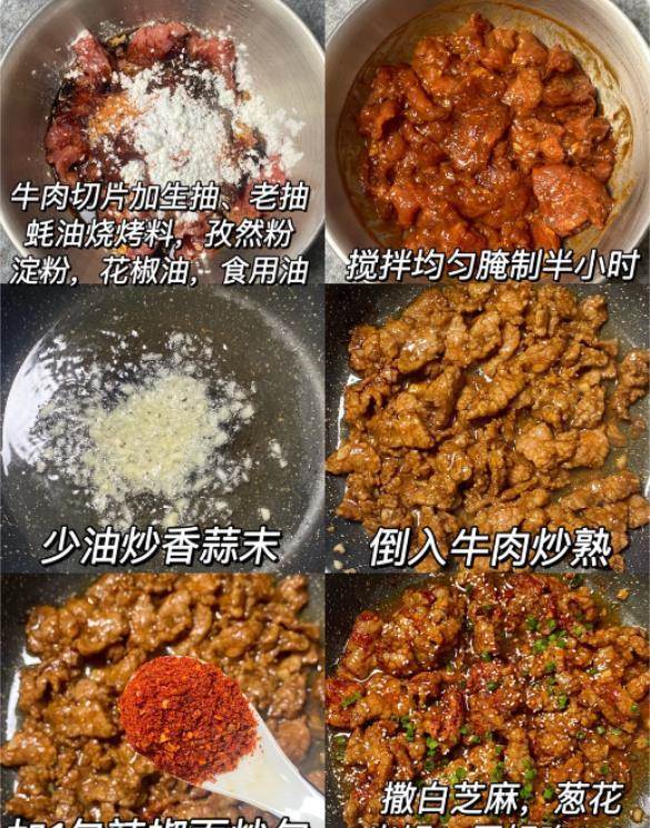 牛肉腌制:牛肉切薄片加2勺生抽、1勺老抽、1勺蠔油、1勺孜然粉、2勺燒烤料、1勺花椒油、1勺淀粉抓拌均勻后,3勺食用油攪勻腌制半小時。