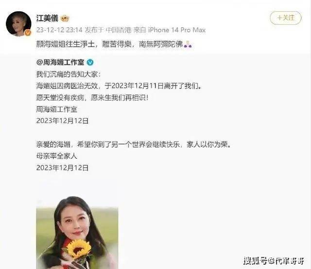 」。江美儀和周海媚是多年的好友,兩人曾合作出演過電視劇《神雕俠侶》。江美儀的悼念文,不僅表達了她對周海媚在另一個世界的祝福,也表達了她對兩人長久以來的情感紐帶的珍惜和牽掛。尹正在社交媒體上發哭臉表示悼念。