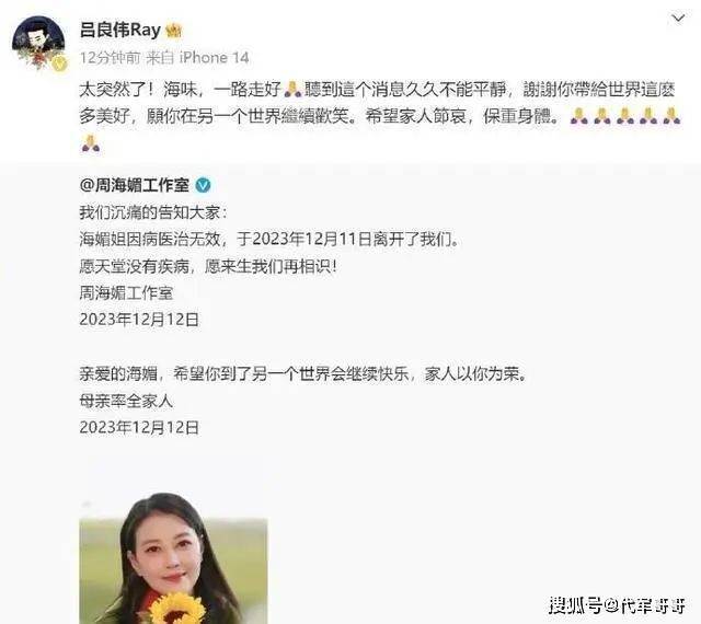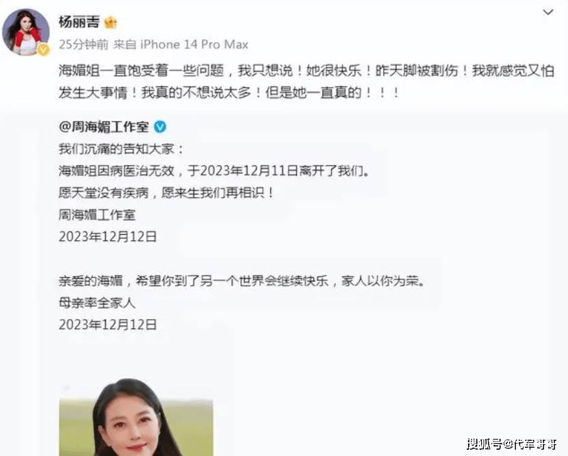 演員楊麗菁轉發周海媚工作室的悼念動態,并悲痛透露周海媚一直飽受著一些問題,但卻知道對方很快樂。