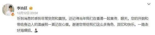 與周海媚在劇集《武媚娘傳奇》中有過合作的演員李治廷在社交媒體上表示:「聽到消息時感到非常突然和震驚,還記得當年我們在香港一起宣傳,聊天。您的開朗和帶給身邊人的溫暖我一直記在心里。謝謝您帶給我們這麼多角色,回憶和快樂,一路走好海媚姐。」