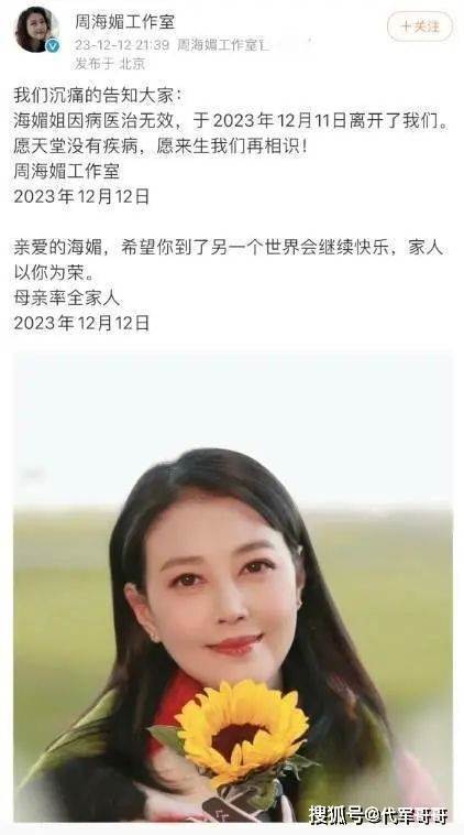 香港知名演員兼主持人周海媚被證實于12月11日去世,終年57歲。周海媚工作室12日晚發布公告稱,「我們沉痛地告知大家,海媚姐因病醫治無效,于2023年12月11日離開了我們」。