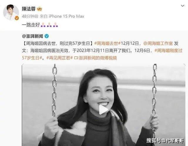 陳法蓉在社交媒體上發文悼念:「一路走好。」。陳法蓉是周海媚的好友,兩人曾合作出演過電視劇《天龍八部》。她的悼念文雖然簡短,但是也表達了她對周海媚的思念和祝福。