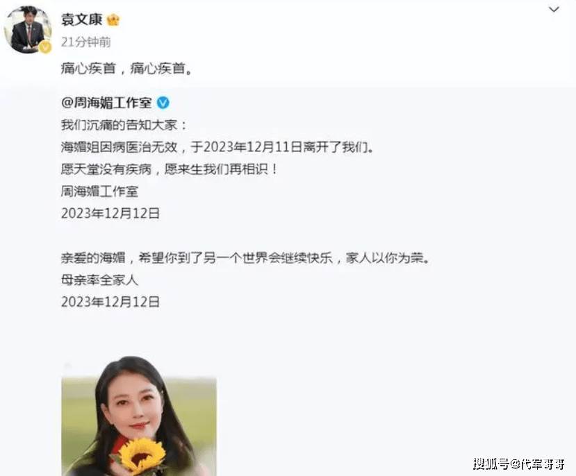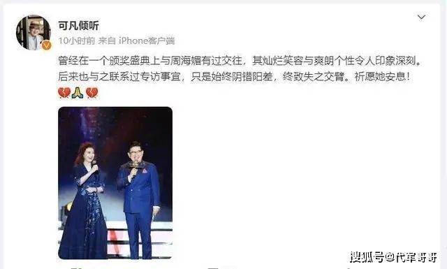 著名主持人曹可凡在個人社交平台發文痛悼周海媚,他直言曾經在一個頒獎盛典上與周海媚有過交往,對方的燦爛笑容與爽朗個性令人印象深刻。曹可凡直言後來也與周海媚聯系過專訪事宜,但終致失之交臂。文末,曹可欣寫道「祈愿她安息」,連續兩個心碎的表情足以看出曹可凡的難過。
