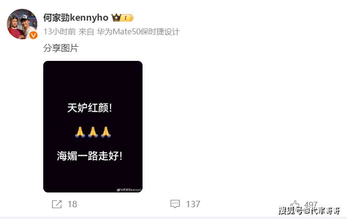 江美儀在社交媒體上發文悼念:「愿海媚姐姐王勝凈土,離得苦樂。