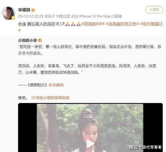 辛曉琪和周海媚是多年的好友,兩人曾一起參演過電視劇《天龍八部》。辛曉琪的悼念文表達了她對周海媚在人們心中的地位的認可和對她的懷念之情。