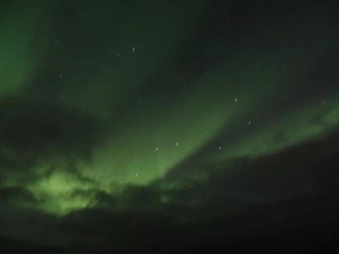 「我們守候了2晚,只看到短短2分鐘——能否看到極光對天氣的要求很高,那天下午五六點還在下大雪,我們本來擔心等不到了,結果半夜1點多突然云開霧散,極光乍現,綠色的光掛在天幕上不停地變換曲線,所有人都屏住呼吸、被驚艷到了.