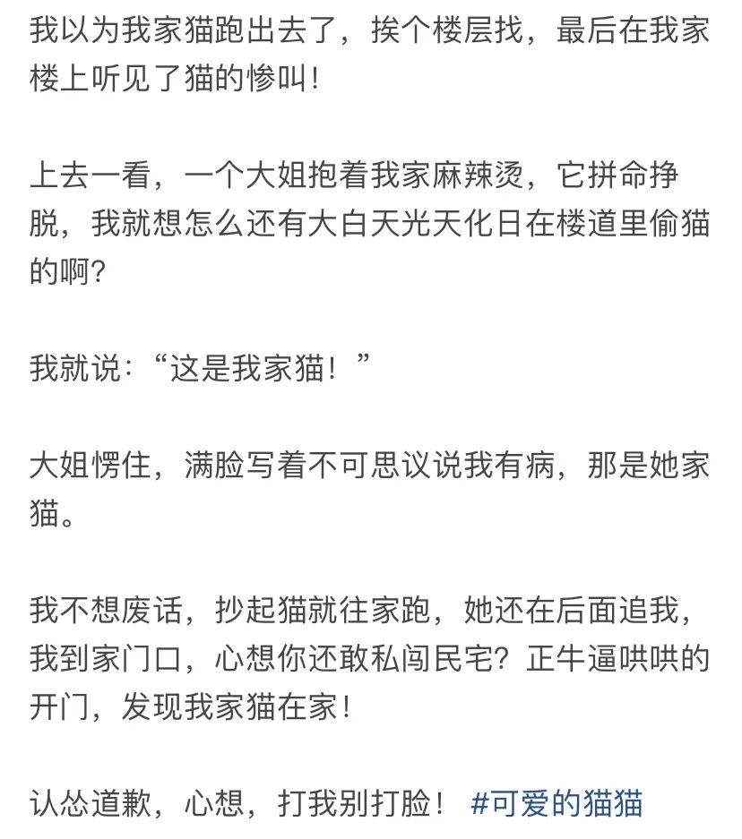 她擴大了搜索范圍,在樓道里一層一層地找,正爬到自家樓層時,突然聽到樓上有小貓的「慘叫」……妹子精神一振,趕緊加快步伐跑過去,就看到一大姐不顧懷里的貍花貓掙扎,非抱著它往家里走。