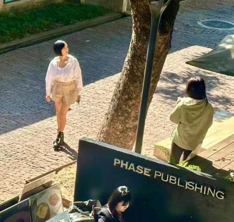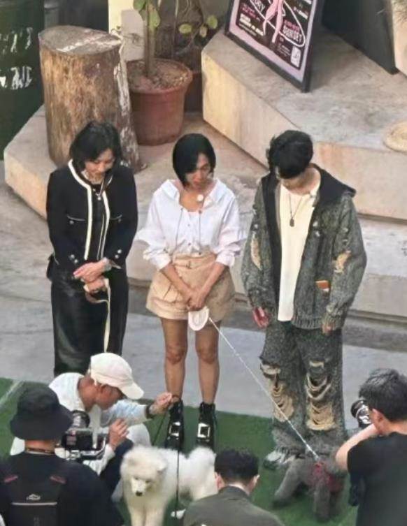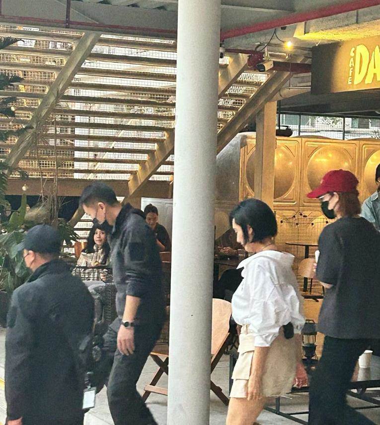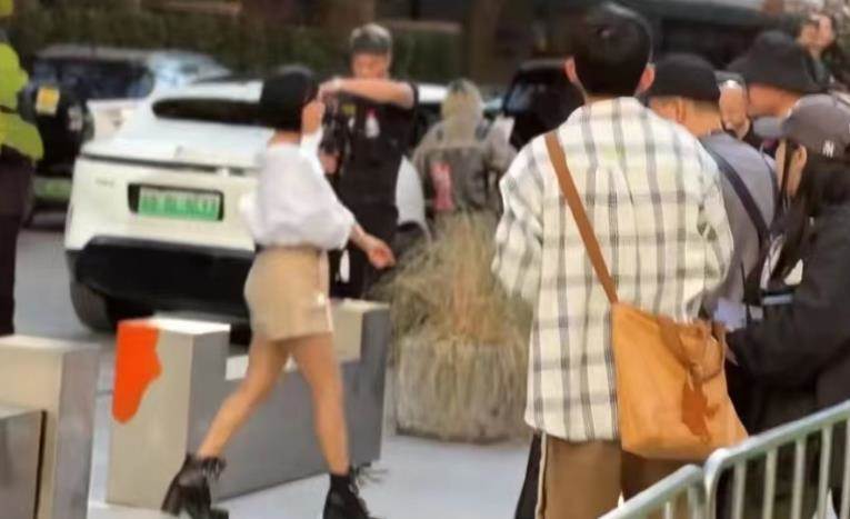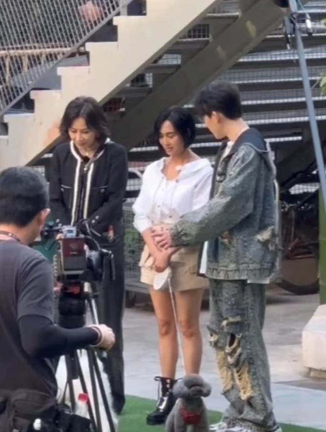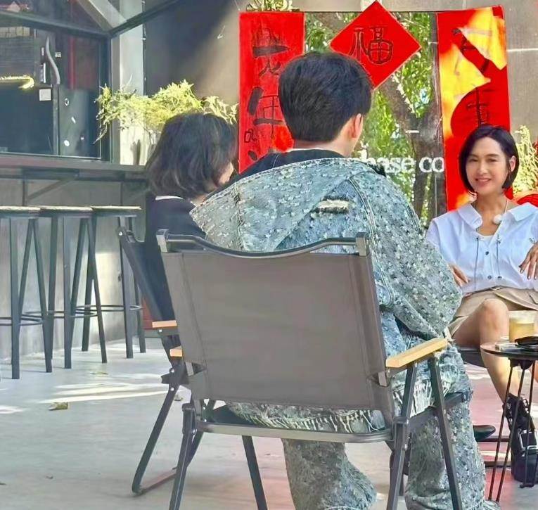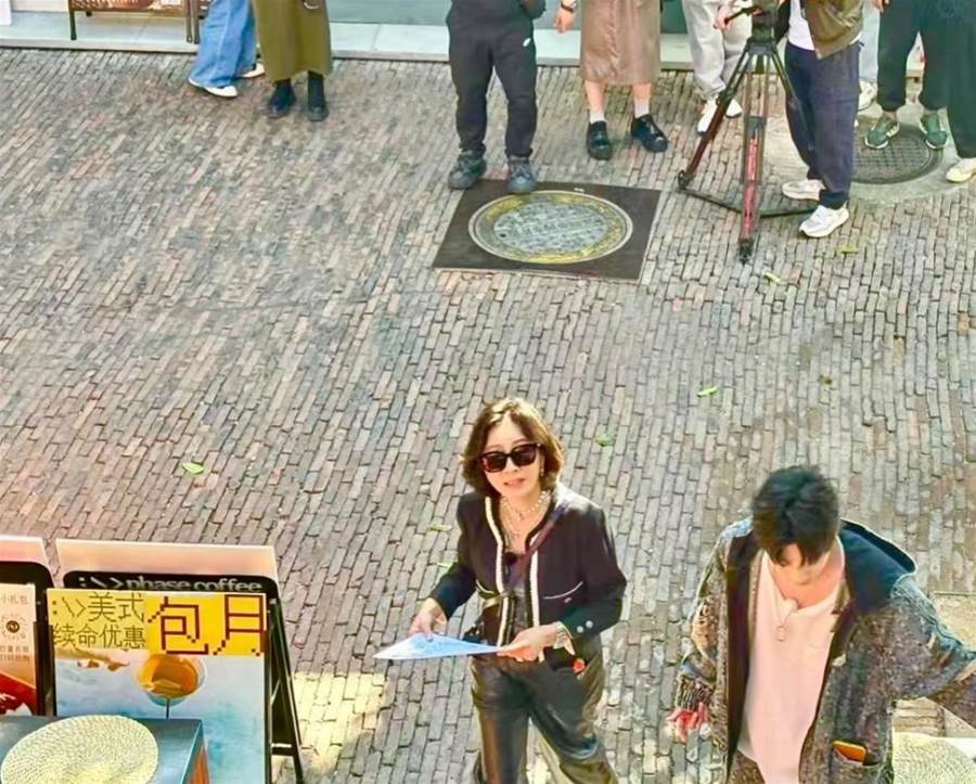 朱茵穿著白襯衫搭配卡其色的褲子,但不知是不是襯衫太大,讓朱茵看上去有些臃腫。此外,朱茵的大腿也頗為粗壯,和身后戴著紅帽子的工作人員比起來,差距相當明顯。
