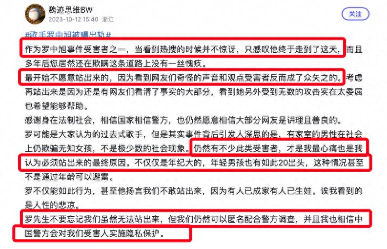 該受害者表示,看到這條熱搜的時候并不驚訝,只是感嘆羅中旭終于走到了如今地步,而且這麼多年在這條路上沒有一絲懺悔。