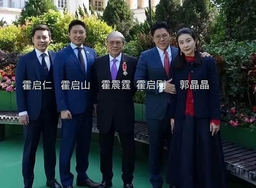 以霍啟剛和郭晶晶夫妻為中心,從左到右依次是霍啟剛的兩個弟弟霍啟仁、霍啟山,而后是霍震寰家的霍啟中、霍啟文,最右邊的則是霍震宇的兒子霍啟智。