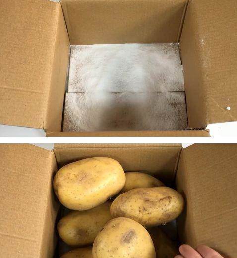 同樣準備紙箱,在紙箱內撒上小蘇打,小蘇打可以非常有效地抑制土豆發芽,將土豆放在紙箱內,這樣發上一年土豆都不會發芽,而且小蘇打還可以吸收水分保持干燥環境,從而就可以延長保存的時間了。