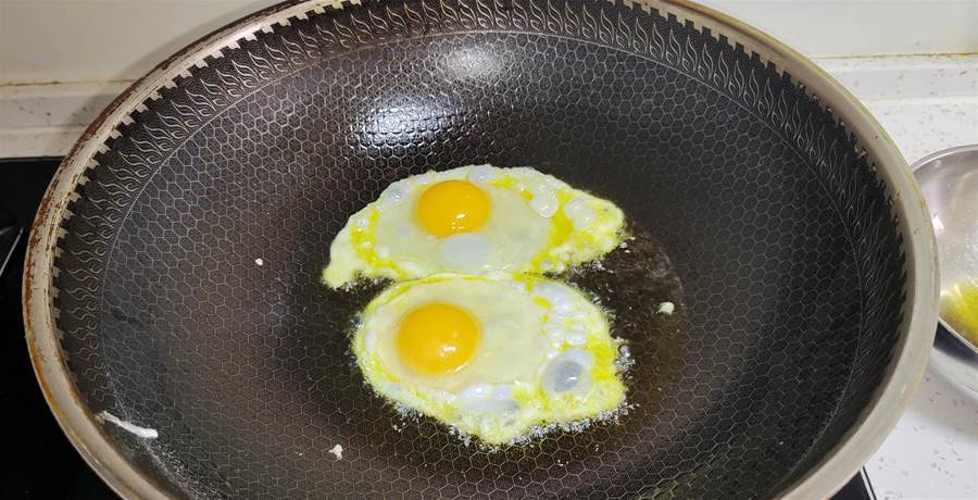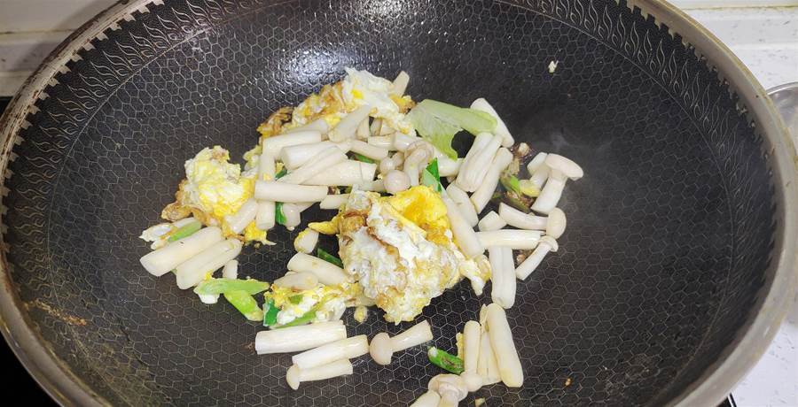 第三步:鍋里燒油,直接打入兩個雞蛋來煎一煎,煎至兩面金黃的時候加入蔥姜炒出香味,同時用勺子將雞蛋切成塊,再將海鮮菇下鍋一塊炒一炒。