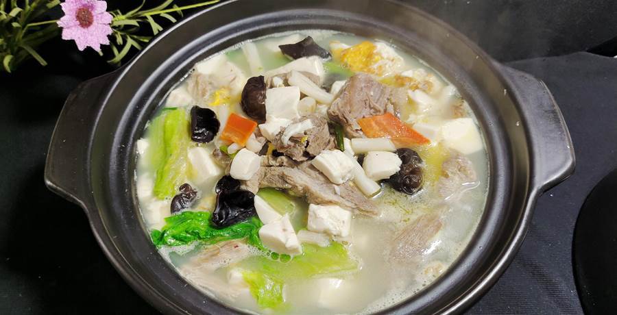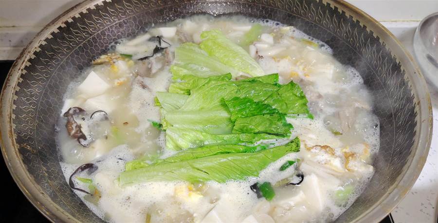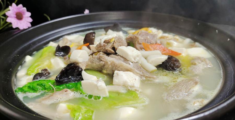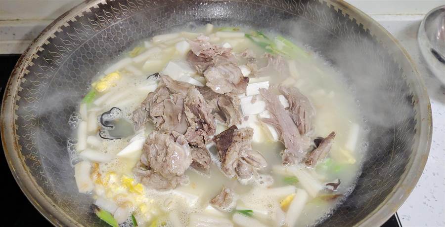 第四步:加入足量的開水,此時會發現湯汁呈現白色,大火煮開后加入食鹽、雞精和胡椒粉來調味,再把豆腐、木耳和拆骨肉一塊下鍋,保持中小火煮個五六分鐘左右。