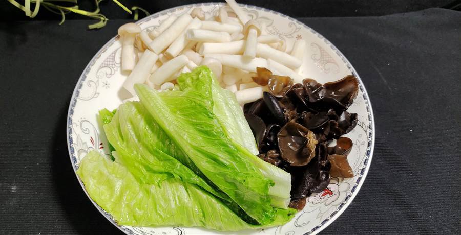 食材準備:拆骨肉適量,嫩豆腐或者老豆腐一塊,海鮮菇一把,木耳少許,雞蛋兩個,食鹽,雞精,胡椒粉,青菜,蔥姜