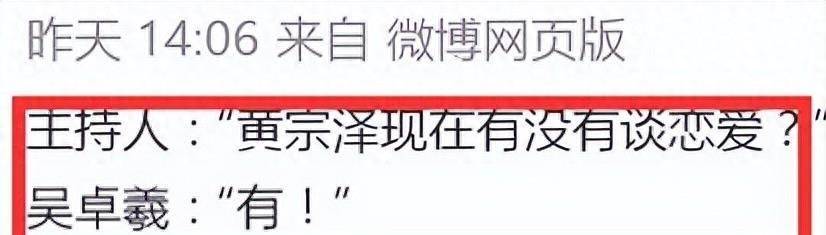 就在幾天前,黃宗澤和吳卓羲一起出席活動,主持人問吳卓羲黃宗澤有沒有談過戀愛,吳卓羲大聲表示「有」。