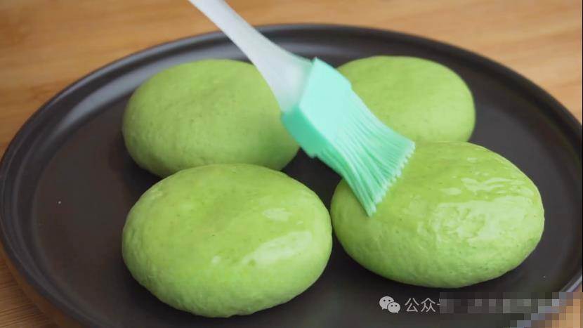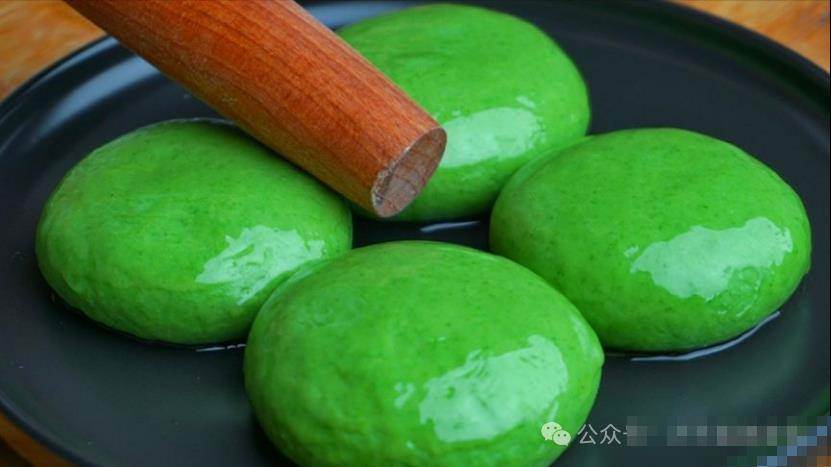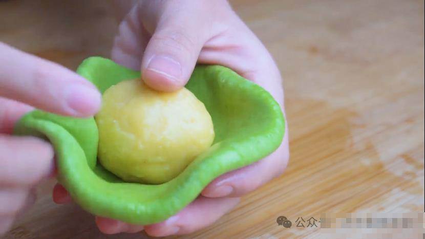 時間到后,取出醒發好的菠菜面團,直接在案板上搟開排氣,將菠菜面團搟成小薄餅。用小薄面片包入奶黃餡小圓球,整理光滑后,蓋上保鮮膜,二次醒發15分鐘。