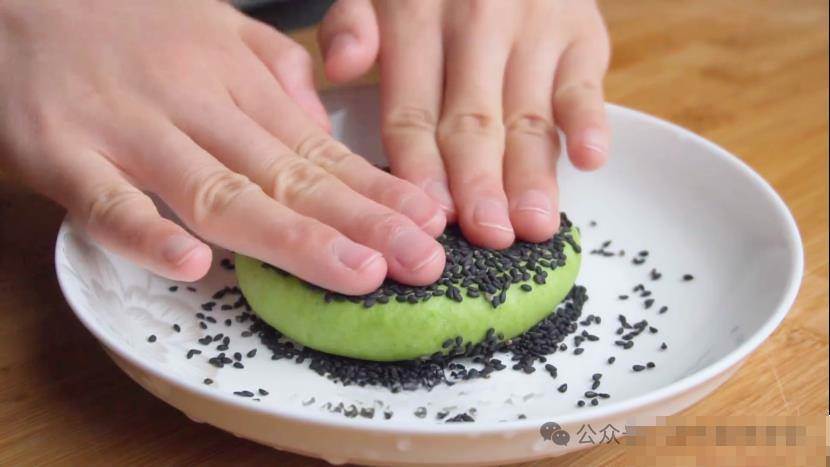 醒發好后,將黑芝麻撒在餅的表面點綴,在稍微按壓下,讓芝麻粘得更牢固些。