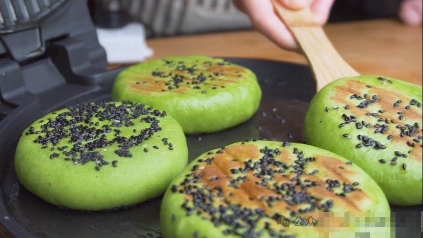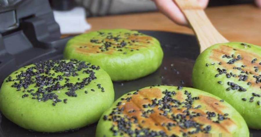 接著把面餅放入烙餅鍋中,翻面烙制,直至小餅表面呈金黃色,表面松軟有彈性,即可出鍋。這樣一道美味的菠菜奶黃餅就完成了!