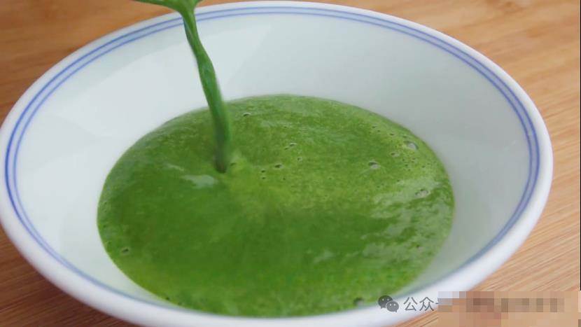 鍋里加水燒開,開水后加入半勺鹽,把洗凈的菠菜放進去焯水中,去除草酸,待菠菜變軟后撈出,放入榨汁機中,加入適量的清水,榨成菠菜汁,大概得到90ml左右,榨好的菠菜汁倒出碗中備用。