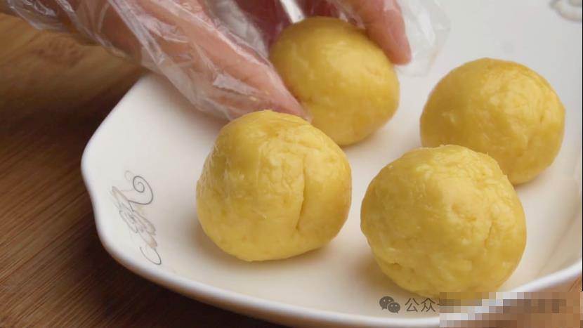 在不沾鍋中刷一層油,倒入面糊,不停地翻炒至濃稠即可,炒好后取出適量奶黃餡,搓成小圓球備用。