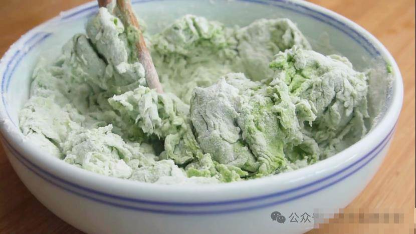 另準備一個大碗,加入200克面粉和2-3克酵母,接著邊攪拌邊加入菠菜汁,攪拌成面絮,再揉成光滑的綠色面團。