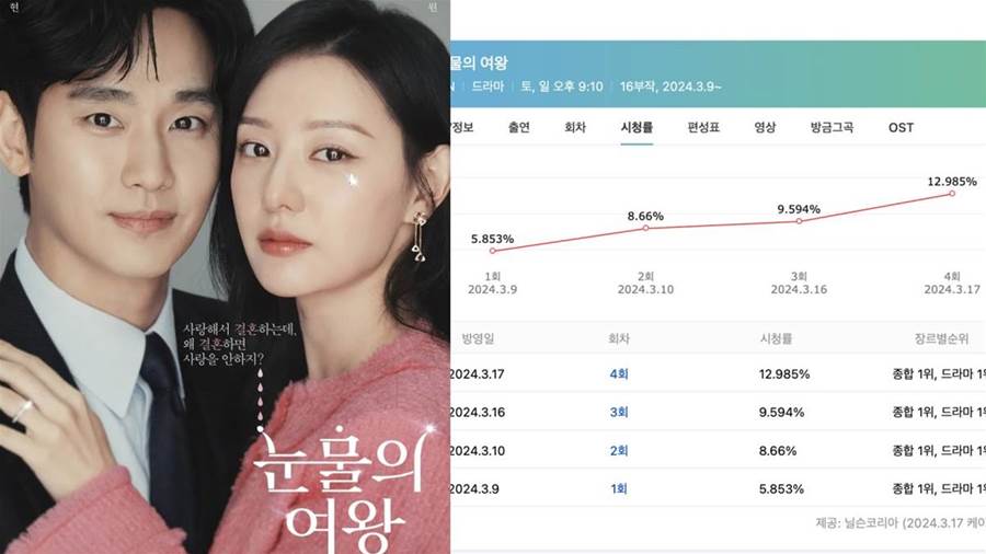 3月9日《淚之女王》正式開播,首播收視率以5.853%(全國基準)出發,每播出一集就在刷新紀錄,第4集收視率已經突破10%,達到了12.985%。