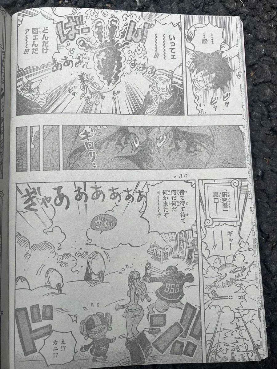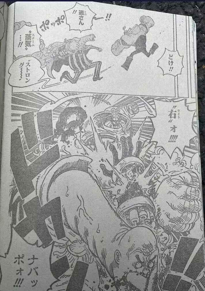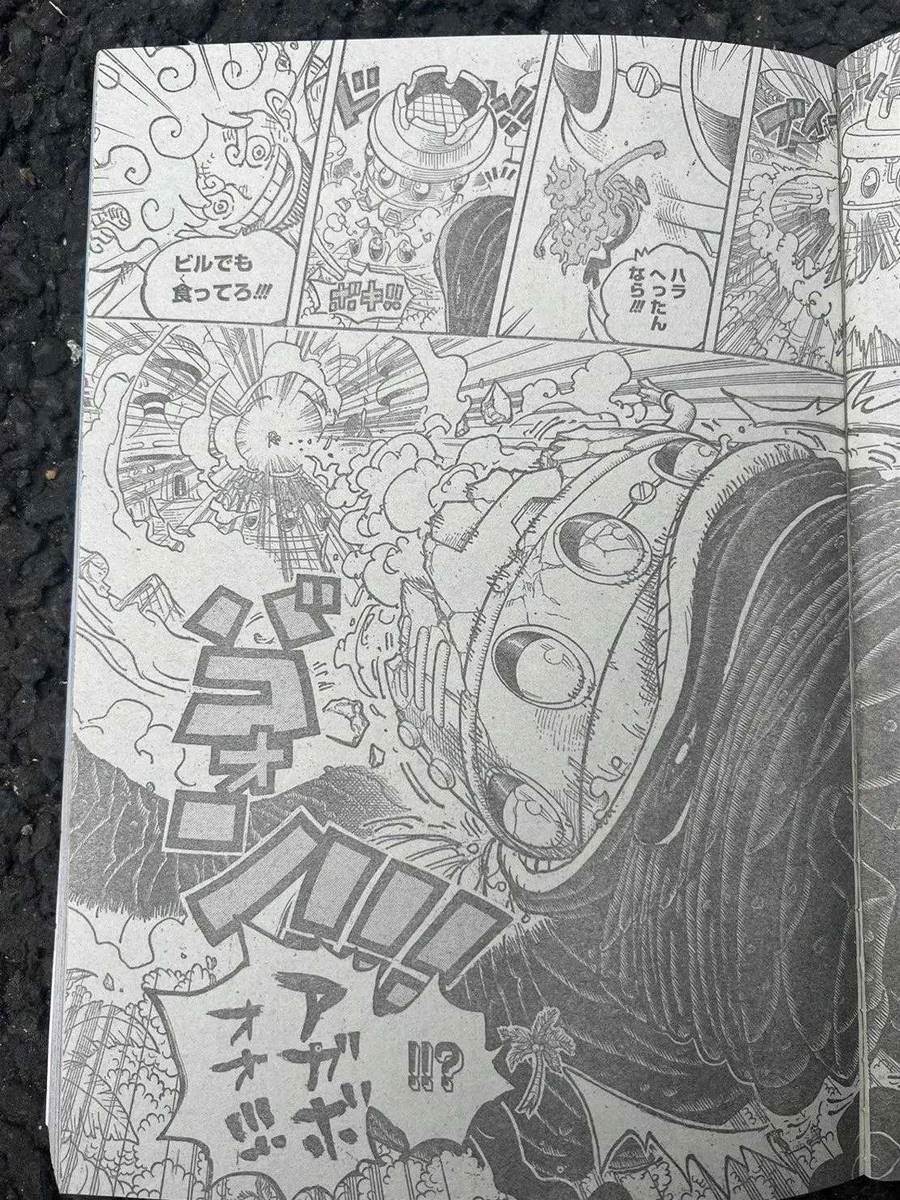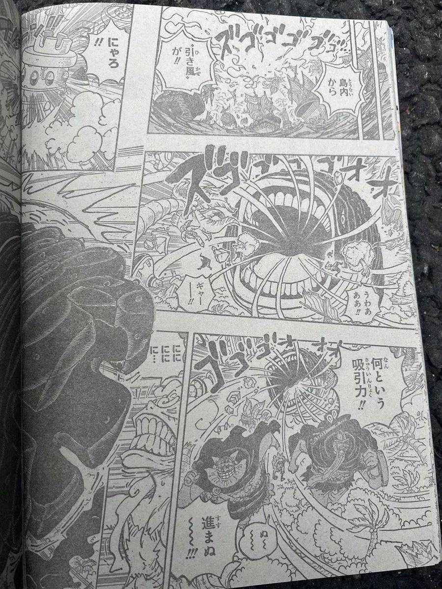 在工廠層中,尼卡魯夫和巨人族正在逃跑,他們無法逃出去,沙蟲正在張開大口,要把草帽小子和巨人族吸過來,巨大的吸引力把草帽小子吸過來了。尼卡魯夫很生氣,直接扛來了一棟建筑物,他直接扔向沙蟲的口中。