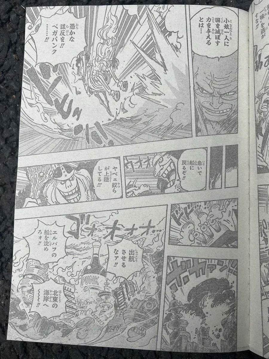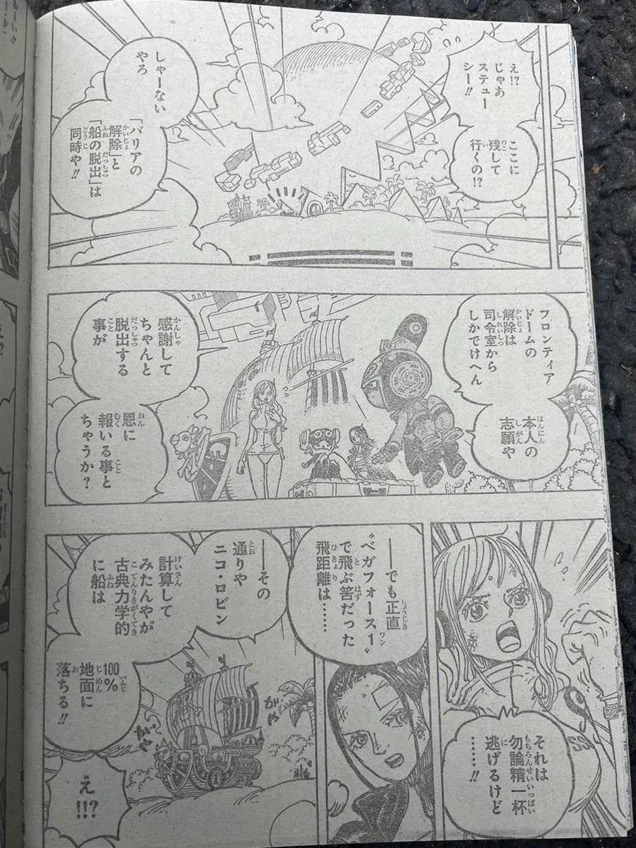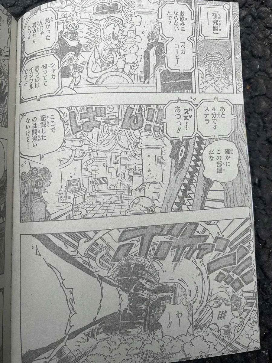 在工廠層中,尼卡魯夫和巨人族正在逃跑,他們無法逃出去,沙蟲正在張開大口,要把草帽小子和巨人族吸過來,巨大的吸引力把草帽小子吸過來了。尼卡魯夫很生氣,直接扛來了一棟建筑物,他直接扔向沙蟲的口中。