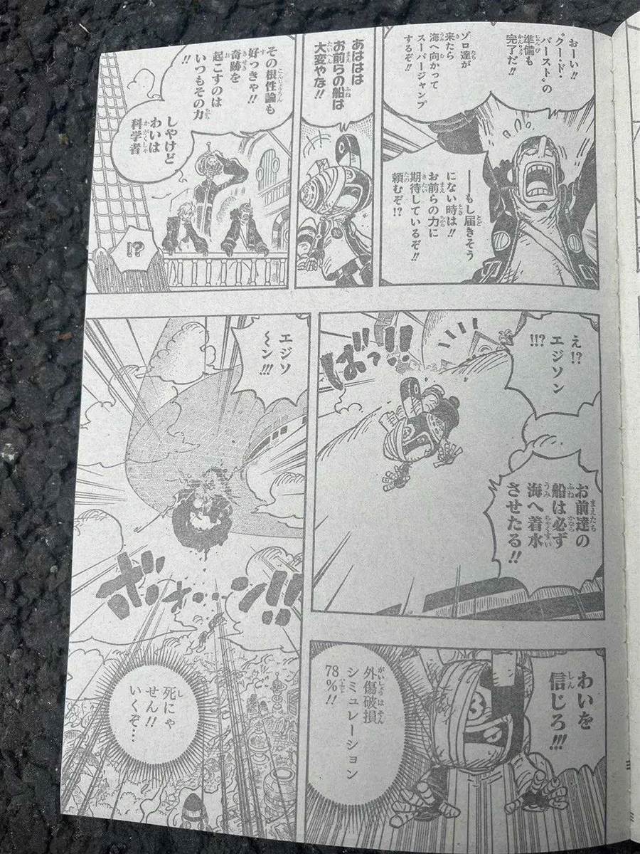 在研究層的入口處,草帽一伙正在等待甚平和索隆回來,愛迪生要出去外面,他直接撞上了防御罩,發生了大爆炸,不過愛迪生沒有死,直接掉落在工廠層了。桑尼號還無法離開研究層,畢竟沒有巨型機器人無法帶桑尼號離開。