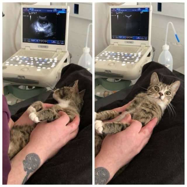 ▼這個消息讓志願者們都很驚訝,在拍攝Ulla做超聲波的過程時,他們還拍下了Ulla得知自己懷孕後,瞪大眼睛吃驚的表情,仿佛在說:「什麼?這是真的嗎?」,Christiansen將這些好笑的照片貼在了Reddit,跟大家一起分享樂趣,沒想到卻意外瘋傳,收穫了9萬個讚和900多條留言,志願者還收到了很多可愛的私訊,感謝他們的付出和努力,也讓他們信心滿滿的繼續收容所的工作。