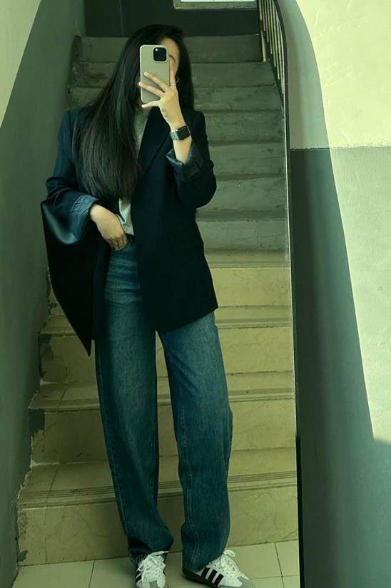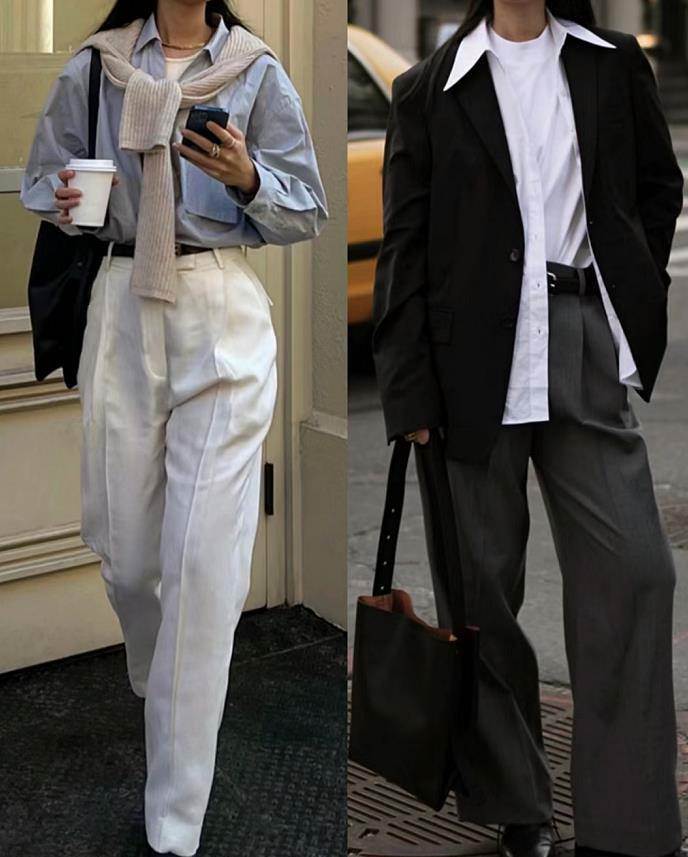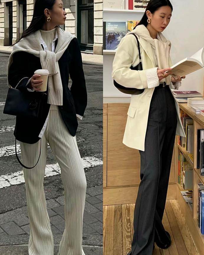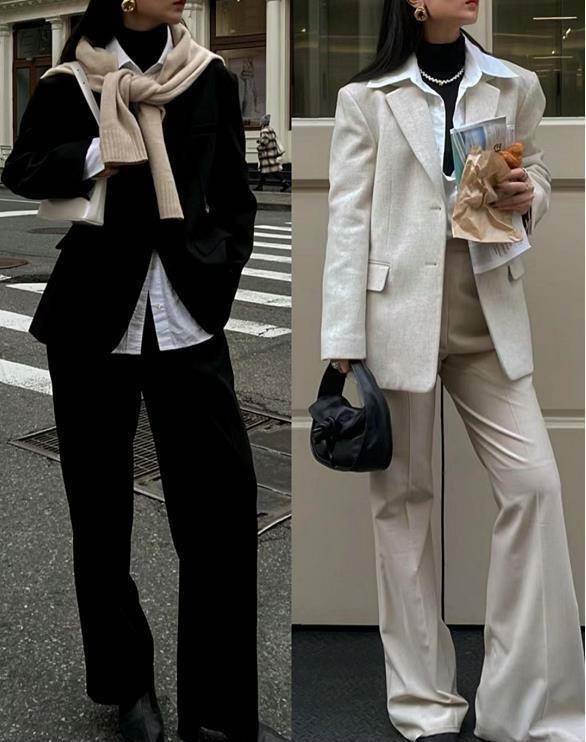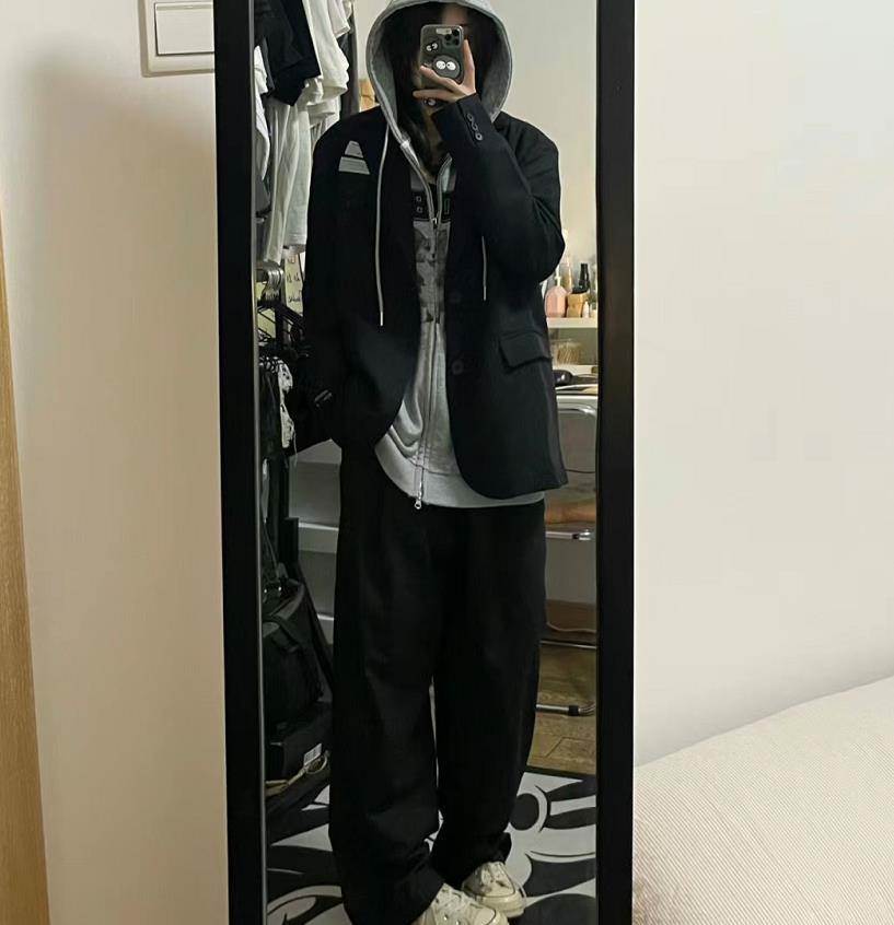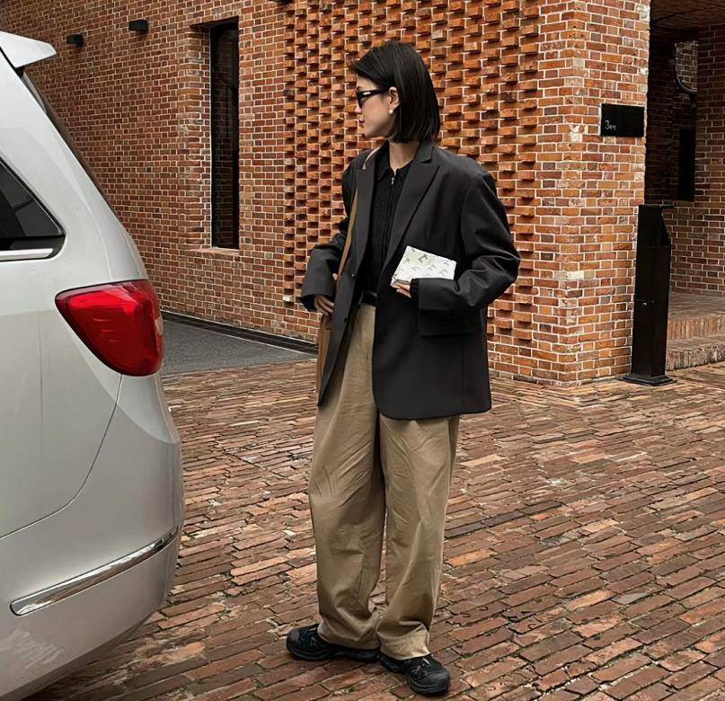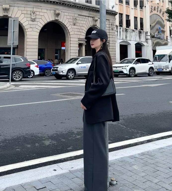 黑色西裝外套+灰色休閑西裝褲,上下都是寬松的版型,輕松打造出松弛感,喜歡這種闊腿版型的褲子,腿粗、不完美腿型穿起來就對了。