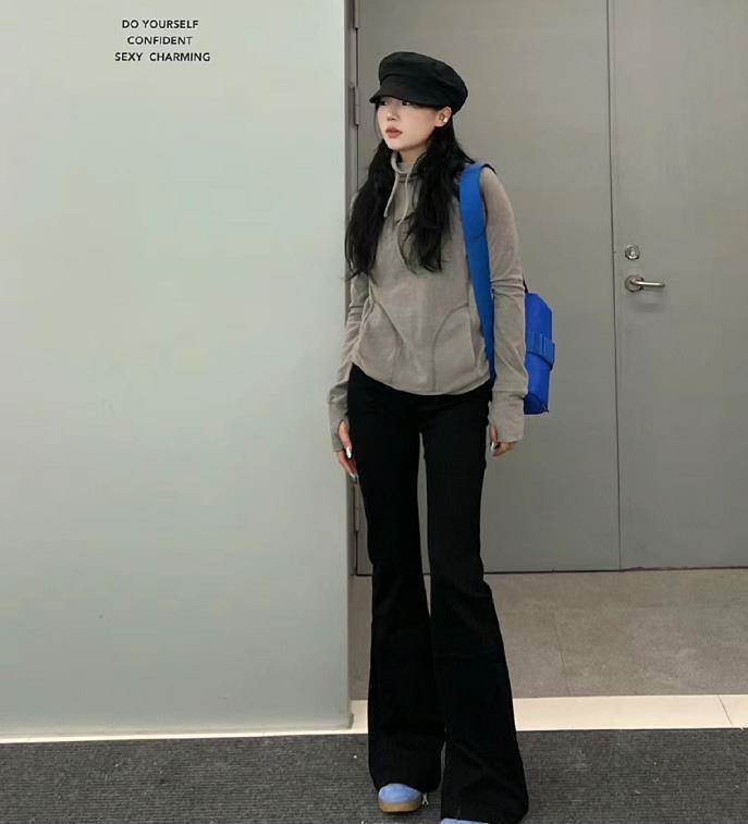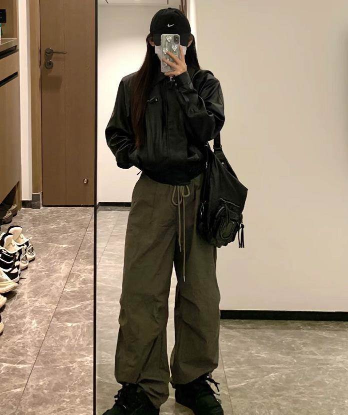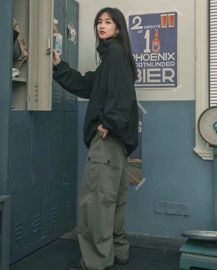 低調時髦的老錢風配色,深灰色西裝+寬松工裝褲,顏色的配色很簡單耐看,上下都是寬松的版型,真的超級藏肉顯瘦。