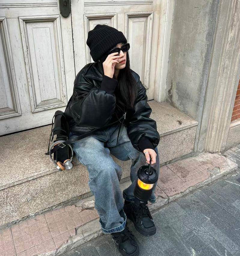 皮衣外套+黑色牛仔長褲,真的既中性,又不失酷酷的味道。