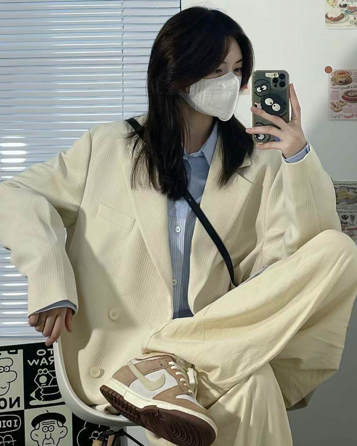 西裝外套疊穿襯衫真的很帥啊,淺淺的色調,完全不用擔心會穿得沉悶啦,版型也是寬松的,我最喜歡這種了,穿得松弛自在又休閑。