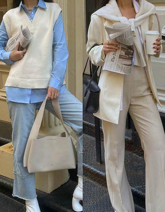 帶點慵懶感的中性風穿搭,配色有些清冷感,低飽和度的配色,覺得不夠出彩的話,可以混搭一些小面積的亮色配飾,這樣就很吸睛了。