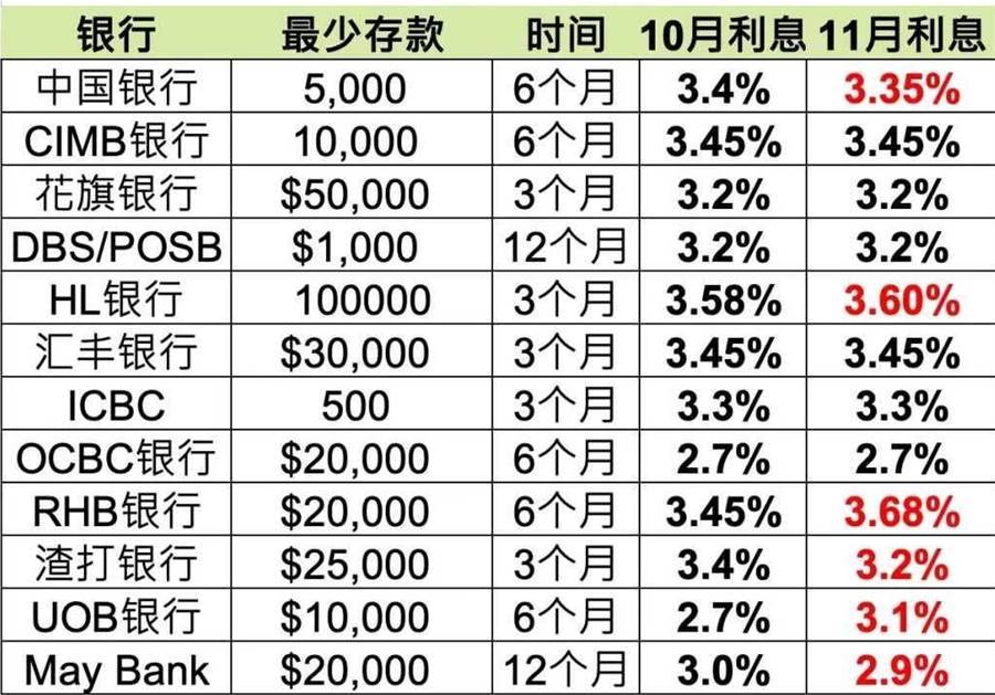截至2023年11月,新加坡各家银行公布了他们的定存利率。在这个月,中国银行、HL银行和RHB银行的利率都是最高的,分别为3.35%、3.60%和3.68%!然而,UOB和OCBC的利率稍微低一些,分别为3.1%和2.7%。赶快来看看11月份各银行的定存利率吧!如果想了解更多信息,直接联系各银行即可!抓住每一个赚钱的机会吧!