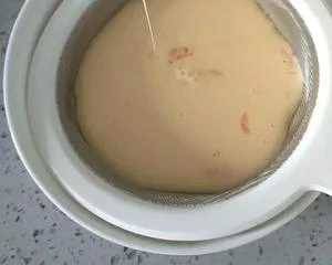 6、這一步很關鍵,把攪拌均勻的蛋撻液倒入篩網過濾,這樣做出的蛋撻口感會很嫩滑,無氣泡。(不可以省略這一步)